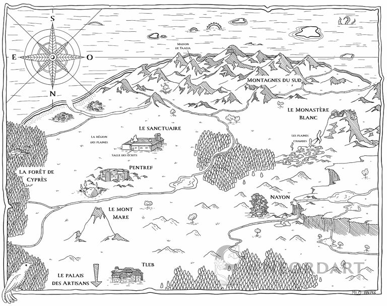 Qui n’aime pas explorer plus en détail son univers favoris ? Montagnes, cités, forêts hantées ou royaumes en ruines : donnons vie à votre univers avec une carte sur mesure, conçue pour allier lisibilité, esthétique et immersion. Parfaite pour vos livres, jeux ou contenus numériques.